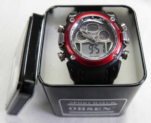 Original Ohsen Sport-Uhr in einem Top-Modernem Design (Analog + Digital - ganz aktuelle Ware aus 2012!). Neu&OVP.Originalverpackt in der schönen Geschenkdose.Produktdetails:* Sportuhr Schwarz/Rot in schöner Dose (siehe Foto)* Top-Modern mit digitaler und analoger Anzeige* Armband aus Silikon* 3 ATM wasserdicht - nicht tauchfähig* LED Leuchtziffern im Hintergrund* Wecker-Funktion* Stoppuhr* Datumsanzeige* Edelstahl-Rückseiten-Gehäuse* Dornschliesse* Gehäuse Durchmesser: 4,5cm Gehäuse Dicke: 1,5cm Armband Länge: 24cm Armband breit: 2,5cm